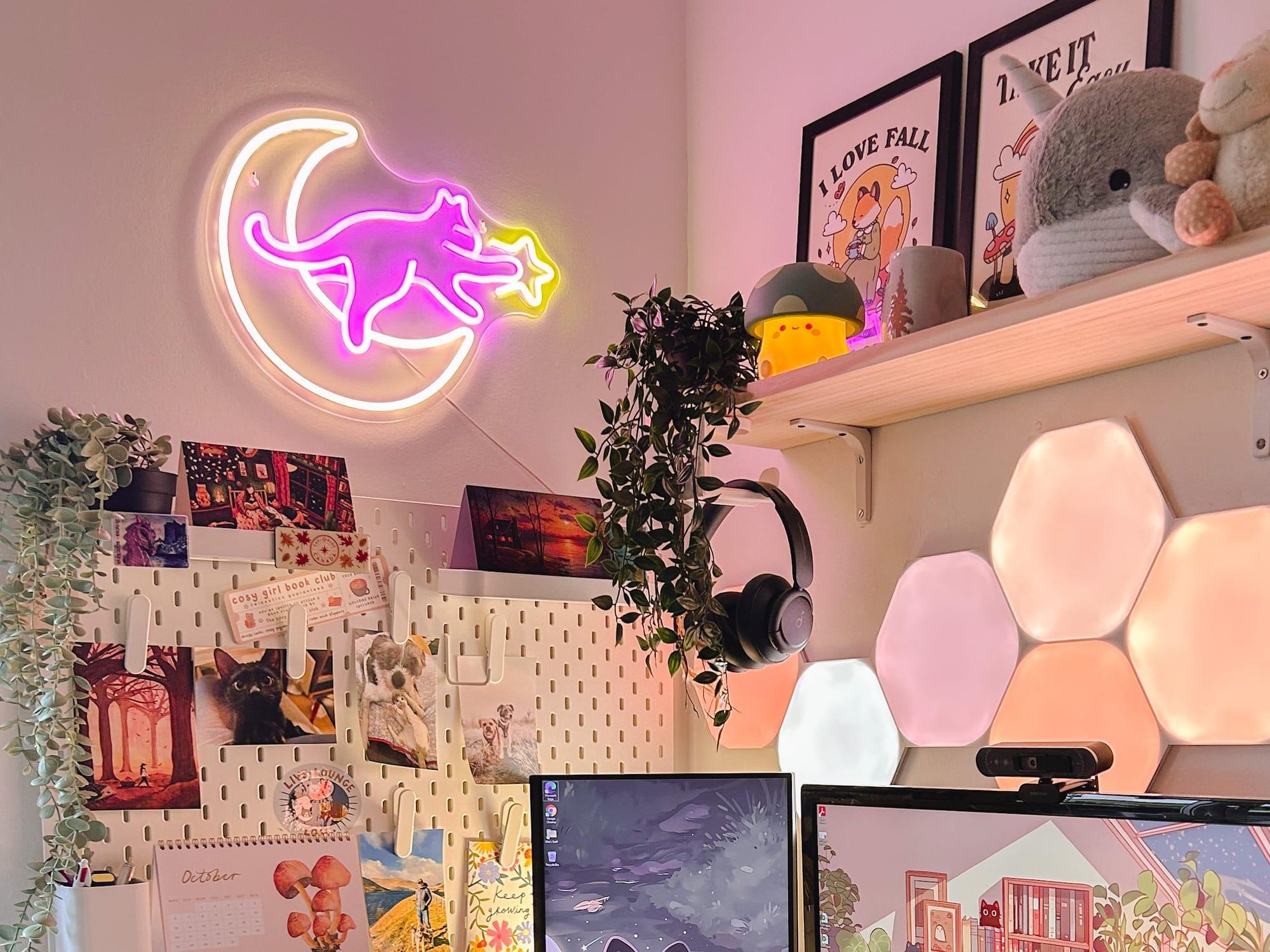 - A neon light of a cat. It’s whimsical, comforting, and a cat - it's my favourite part of the setup.
