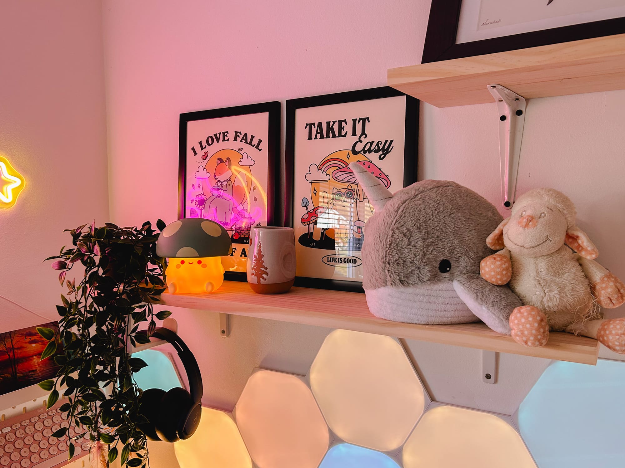 - Shelves above my desk that hold more plants, framed cozy artwork, and my favourite plushies to keep me company through long workdays.